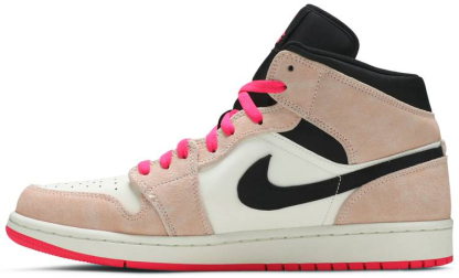 Updating the original in a rosy motif . the 1 Mid SE 'Crimson Tint' comes with black-on-white body contrast . pink nubuck overlays and hot-pink laces and outsole. Created by Peter Moore in 1985 for a young superstar who'd recently entered the NBA . the shoe's history and durability make it a frequent template for modern artistic inspiration.